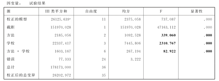 •方法与学校作用的交互作用的F 统计量的值为82.922,相应的显著性概率p=0.000<0.05,说明方法与学校作用的交互作用对教学效果的影响也是显著的;