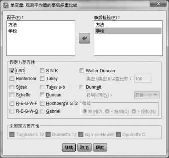 ⑦单击【事后多重比较】按钮,系统弹出一个新对话框,如图6.12所示。在该对话框的上半部分,我们选择需要对因素的水平做两两比较的变量,这时该对话框下半部分靠上的“假定方差齐性”区块被激活,此时选择“LSD”,用最小显著性差异方法(t统计量的一种变形)来两两检验各水平效果均值是否有显著性差异。而该对话框下半部分的“未假定方差齐性”区块没有被激活,因为方差非齐性问题可以通过数据转换,使其接近齐性,如将Box-cox转换、对数转换、正态转换等转化为方差齐性来解决,所以SPSS在这个菜单下只针对方差齐性设计了算法。