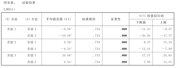c.表6.17是方法的不同等级对教学效果的影响的两两多重比较的检验结果,从显著性概率来看,3种方法彼此之间的显著性概率都小于0.05,所以方法的不同等级之间都存在显著性差异;