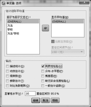 ⑤单击【选项】按钮,系统弹出一个新对话框,如图6.11所示。在该对话框的上半部分,选择“OVERALL”,即对3个变量——方法、学校、方法*学校,都要做分析。在该对话框的下半部分,选择方差的“同质性检验”。
