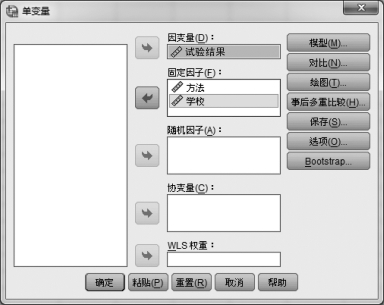 ③选中左框的变量“方法”和“学校”,放入右边的“固定因子”框中,如图6.10所示。
