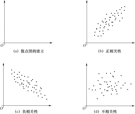 散点图又称相关图,它以直角坐标系的横轴代表一个变量,以纵轴代表另一个变量,将两个变量间相对应的变量值用坐标点的形式描绘出来,即用图形的形式反映两个变量之间的相关关系。散点图表示因变量随自变量而变化的大致趋势,如图7.1所示。