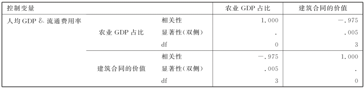 在表7.4中,偏相关系数是-0.975,显著性概率p=0.005<0.05,说明剔除了“人均GDP”和“流通费用率”的影响后,变量“农业GDP占比”和“建筑合同的价值”仍然存在显著性的关系。