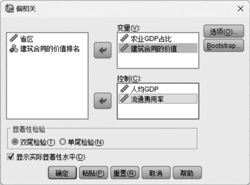 ②在偏相关相关分析模块对话框(如图7.7所示)中,选中左框的变量“农业GDP 占比”和“建筑合同的价值”放入右边的“变量”框中。