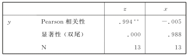 从表7.6的数据可以看出,y 与x 之间t 检验显著性概率为0.988,显然y 与x 不存在显著性线性相关的关系。但是y 与z 之间的线性相关系数(表7.6中的Pearson相关性)是0.994,显著性(双尾)p 值为0.000(在SPSS输出的表格中,双击这个数字,会显示更精确的值),小于0.01,这说明在0.01的显著性水平上该线性相关系数与0有显著性差异。这表明,可以推断y 与x 之间是以构造的函数形式高度非线性相关的。