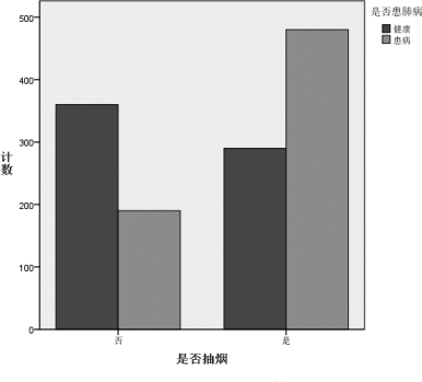 ④单击【确定】按钮,就得到图7.17了。从图7.17看出,不抽烟的患肺病人数在较低的位置,而抽烟的患肺病人数的在相对高的位置。看来,两个变量可能有相关的关系。两个二值名义级变量的相关系数用φ 表示,在这种情况下其就是Pearson相关系数。