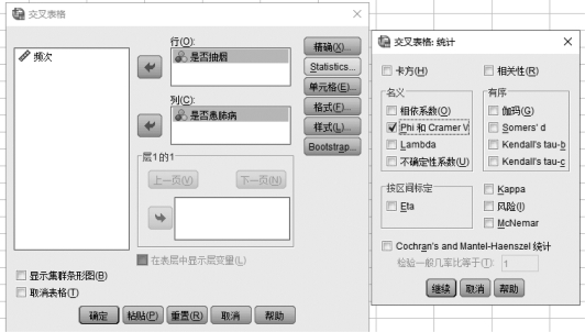 ③单击【Statistics】按钮,在弹出的框中选择“Phi和Gramer V”统计量,也就是φ 相关系数,如图7.18所示。