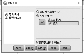 在SPSS数据文件中,每一条记录表示一个被抽到的人,变量值有两个,一个是“是否抽烟”,一个是“是否患肺病”。打开这个数据文件后,发现它是图7.14所示的缩约格式的,所以,先要对其进行加权处理。