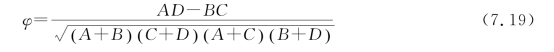 注:这里的正、负号是无关紧要的,因为改变任何一个二值名义级变量取值的编码位置时,φ 相关系数的符号都会改变但其绝对值不会变,读者可以试着自己证明一下。