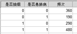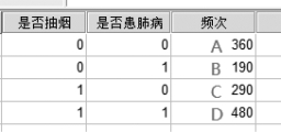 例7.8 某市关于“抽烟与患肺病”的抽样调查结果是:不抽烟健康人员有360人,不抽烟患肺病人员有190人,抽烟健康人员有290人,抽烟患肺病人员有480人,数据见文件“CH7例7.8抽烟与肺病”。