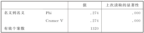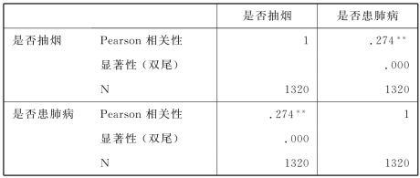 ⑩单击【确定】按钮,系统输出结果,如表7.10所示。表7.10中的数据显示,“是否抽烟”与“是否患肺病”的φ 相关系数是0.274,显著性概率是0.000(双击后看到具体数值是5.57×10-24),拒绝零假设,φ 相关系数与0存在显著性差异,也就是说,拒绝两个变量不相关的假设。