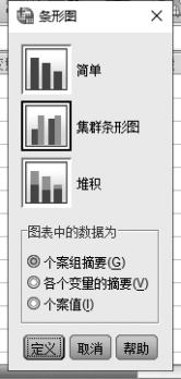 ②单击【图形】→【旧对话框】→【条形图】→【集群条形图】,图形中的数据默认选择“个案组摘要”,如图7.16所示。然后单击【定义】按钮,进入“定义堆积条形图”对话框。