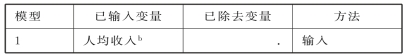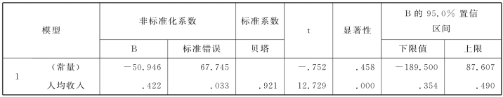 的标准误差Sj。第三列为标准系数贝塔。第四列为t值。第五列为t值的显著性概率p 值。在本例中,常数项的t检验不通过,p=0.458>0.05,即对应的系数与0 无显著性差异。自变量“人均收入”的t检验通过,p=0.000<0.05,即相应的系数显著异于0。第六列是B 的95.0%置信区间。
