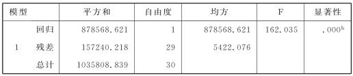 表8.3是方差分析表,给出了方差分析的结果。该表第1列给出了总变差的来源:回归、残差和总计(总计为回归和残差之和)。该表第2列为“平方和”,分别为回归行对应的变差(就是已解释变差)、残差行对应的变差(就是残差平方和)、总计行对应的变差(就是总变差)。该表第3列为“自由度”(回归行对应的自由度是k-1,残差行的自由度是n-k,总计行对应的自由度是k-1+n-k=n-1)。该表第4列为“均方”,为前面两列相除,即“平方和”除以“自由度”。该表第5列为“F”,即方差检验F 值。该表第6列为“显著性”,为F 值的显著性概率值。