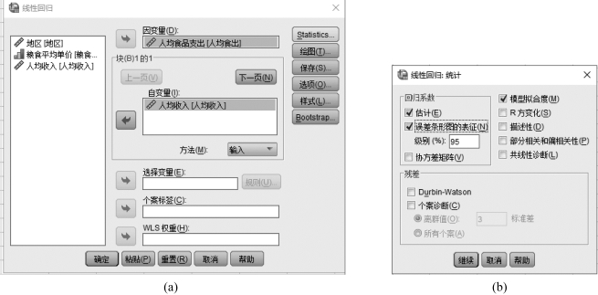 ②在该对话框的左栏中选择变量“人均食品支出”,单击向右的箭头,将其放入“因变量”框中。在左栏中选择变量“人均收入”,单击向右的箭头,将其放入“自变量”框中,如图8.1(a)所示。