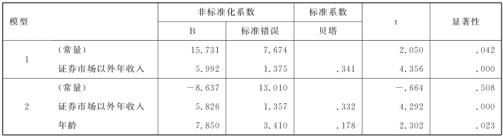 c.模型中的预测变量:(常量),证券市场以外年收入,年龄