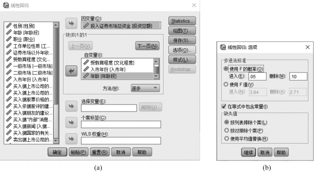 ②在该对话框的左栏中选择变量“投入证券市场总资金”,单击向右的箭头,将其放入“因变量”框中。在对话框左栏中选择变量“证券市场以外年收入”“受教育程度”“入市年份”和“年龄”(即股民年龄)单击向右的箭头,将其放入“自变量”框中,如图8.4(a)所示。