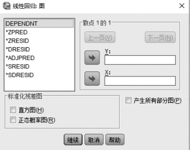 ⑦单击“线性回归”对话框右上方的【绘图】按钮,系统弹出所要绘制图形的对话框,如图8.6所示。在该对话框的左框中有因变量和一些参数,可选一些变量或参数用箭头送入“X”(或“Y”)框,选其他参数送入“Y”(或“X”)框。完成计算后,系统就按照这里的选择输出图形。可供选择参数主要有如下几种。