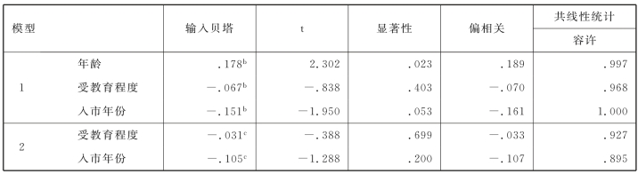 表8.12是排除的系数的显著性检验表,“受教育程度”和“入市年份”没有进入方程,从表中可以看到这两个变量以及常量的系数显著性概率的变化情况。