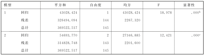表8.10的第一列给出了逐步回归过程中的4个模型。从中可以看到,平方和(“平方和”列与每个模型的“回归”行的交叉位置上的数据)随着逐步回归的过程,不断增大:从43 028.424增大到54 693.770。这就是说,随着逐步回归中模型的改进,已解释变差越来越大。从表8.10中的最后一列可以看到模型b和c的F 统计值的显著性概率都小于0.01,说明两个模型的总体回归效果都是显著的。