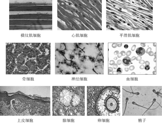 人体内的细胞可分为肌细胞、骨细胞、神经细胞、血细胞、上皮细胞、腺细胞和生殖细胞等(图1-0-2)。细胞大小不一,形态万千,功能多样,但细胞都由细胞膜、细胞质、细胞核这三部分组成(图1-0-3)。