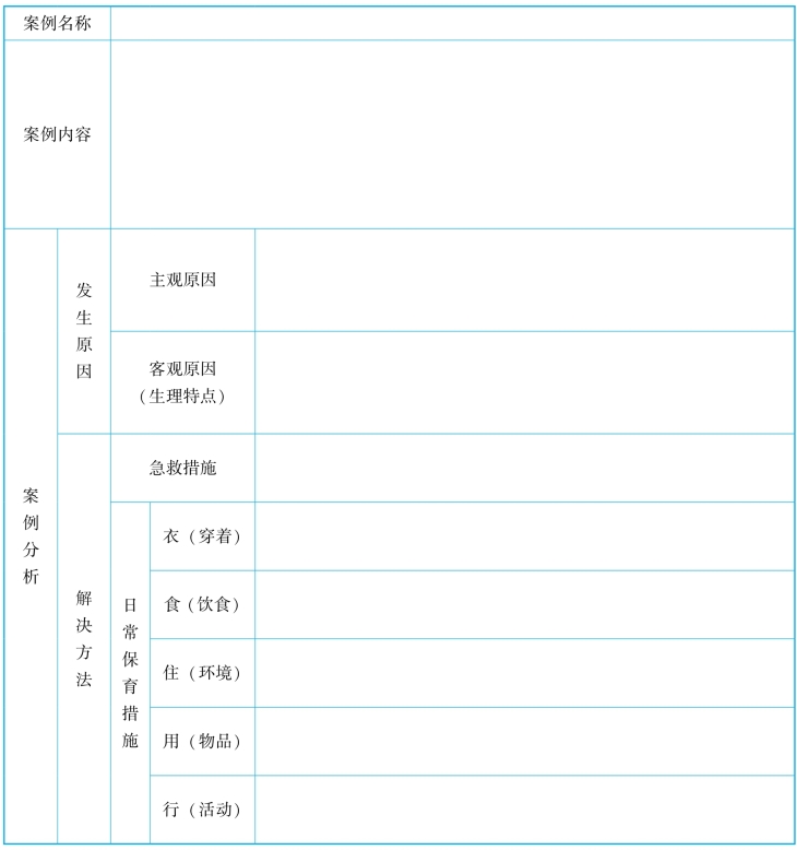 3.解决方法中急救措施栏填写案例发生后第一时间的急救措施——可以挽救生命,将伤害降到最低;日常保育措施栏填写在幼儿日常生活中的保育措施,防止此类事件再次发生。