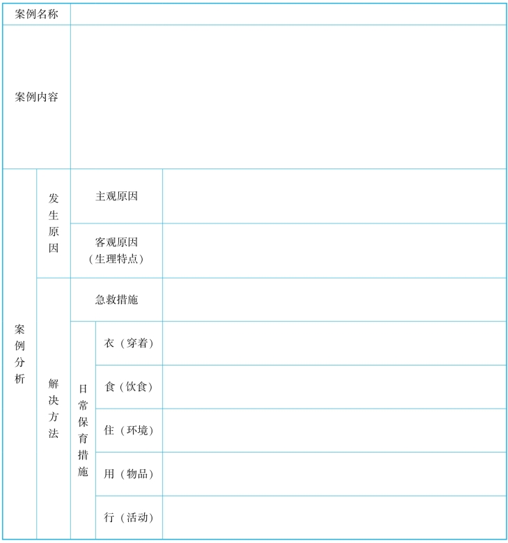 3.解决方法中急救措施栏填写案例发生后第一时间的急救措施——可以挽救生命,将伤害降到最低;日常保育措施栏填写在幼儿日常生活中的保育措施,防止此类事件再次发生。