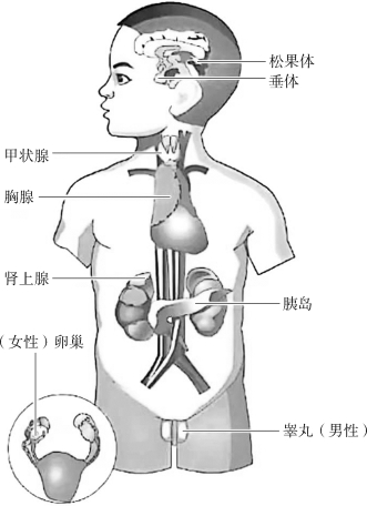 内分泌系统由内分泌腺和分布在人体各处的内分泌细胞(如胃肠内分泌细胞)组成,它是神经系统以外的另一重要调节系统。人体主要的内分泌腺有:垂体、甲状腺、甲状旁腺、松果体、胸腺、肾上腺、胰腺、性腺(女性是卵巢,男性是睾丸)(图1-8-1)。这些腺体分泌的特殊物质称为激素,激素直接进入血管或淋巴管,再经血液循环系统输送到身体各个部位,调节机体的新陈代谢、生长发育、生殖以及免疫等功能(即体液调节)。