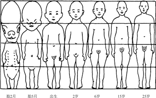 在生长发育的过程中,身体各部分的发育比例是不同的。即从胎儿时较大的头颅、较长的躯干和短小的双腿,发育到成人时较小的头颅(占1/8)、较短的上身和较长的双腿(图2-1-2)。