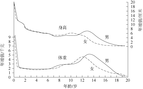 儿童生长发育的速度并不是直线上升的,而是呈波浪式的、不等速的,在整个生长发育期,全身和大多数器官、系统有两次生长突增高峰,第一次是在胎儿期,第二次是在青春发育初期,而且女比男大约早2年出现(图2-1-1)。