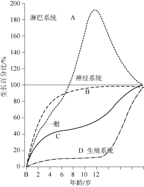 身体的不同器官或系统的发育不是同时进行的。某一器官可能增长得快,另一些器官增长得比较慢,有的器官却在一定阶段趋于退化。呈现出不同的发育趋势:神经系统领先发育;淋巴系统发育得最快;生殖系统发育较晚(图2-1-3)。