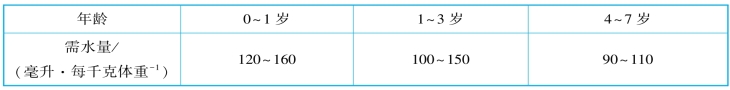 学前儿童新陈代谢旺盛,体表面积相对较大,水分蒸发多,所以每千克体重需水量相对比成人高,而且年龄越小,需水量相对越多。各年龄儿童每日水的需要量见表2-4-4。体力活动、气候状况及食物性质等都会影响学前儿童对水的需要量。活动量大、气温高需水量多,多食蛋白质和无机盐时,因排泄这些物质需水较多,所以也会增加水的需要量。在发烧、呕吐、腹泻时应注意补充水分。