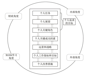 为提高劳动生产率,自身的需要和组织的需要必须保持一致,进而针对员工规则持续改进。而传统的BSC 对学习的投入不够,很少考虑到员工具体的个人抱负和幸福感,未能使个人和组织的绩效与学习在可持续的基础上相互促进。对此,Rampersad 等[92]依据BSC 四维度划分,从个人使命、愿景、核心角色、关键成果因素、目标、绩效测度、靶标以及改进行为等层次围绕BSC 四大层次构建了个人BSC(PBSC),它关注个人技能和行为的持续改进,聚焦个人幸福和成功,其中个人的自我管理是PBSC 的核心。