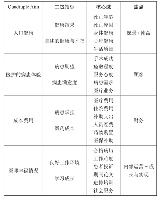 Berwick 等[29]为美国提出了一种优化卫生系统服务的Triple Aim (三重目标)框架,其核心在于为了得到预期的结果,在系统层面同时聚焦增强病患体验、改进人民健康和降低人均医疗成本三大维度。在全球范围内医疗卫生系统都在努力应对在改善人口健康的同时降低医疗成本挑战的背景下,三重目标理论被世界各地许多组织采纳为一套医疗体系改革原则。