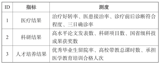 在医师医、教、研结果具体指标的征询过程中,专家组考虑到部分绩效指标在具体含义和评价意图上的重叠性和紧密相关性,建议将均能衡量治疗有效程度的指标“医患病死率”“治愈率”“病情好转率”“治疗有效率”“抢救成功率”“无菌手术甲级愈合率”等指标合并为“治疗好转率”;将均与诊断正确性相关的指标“诊断正确率”“治疗误诊率”“治疗漏诊率”“术前后诊断符合率”合并为“诊疗前后诊断符合率”;将刻画医疗事故及并发症发生的指标“医后感染率”“并发症发生率”“医疗事故差错发生率”合并为“医疗事故差错发生率”;将刻画医师人才培养相关的指标“优秀带教次数”与“带教课时数”合并归为“高校带教总课时数”。对于表述不清的指标“科研成果数”,部分专家建议将其删除,并运用高水平论文、创新项目、科技成果等指标加以衡量;将“创新技术项目数”“科研立项数”“课题经费”整合为“科研项目数”。此外,部分专家认为指标“平均治愈日”无法有效衡量医师实际医疗诊治水平,需要根据医患实际情况及医治条件进行综合衡量,因此建议删除该指标。最后,部分专家认为仅通过对医患治愈率的高低并不能直接判定医师医疗水平如何,需要兼顾医师对不同患者的接治情况,例如医师对传染性疾病或疑难杂症患者是否接治。因此,部分专家提议增添医患接治率指标,不仅能与治疗好转率等指标协同衡量医师绩效,还能有效涵盖公立医院医师的医德医风内涵。