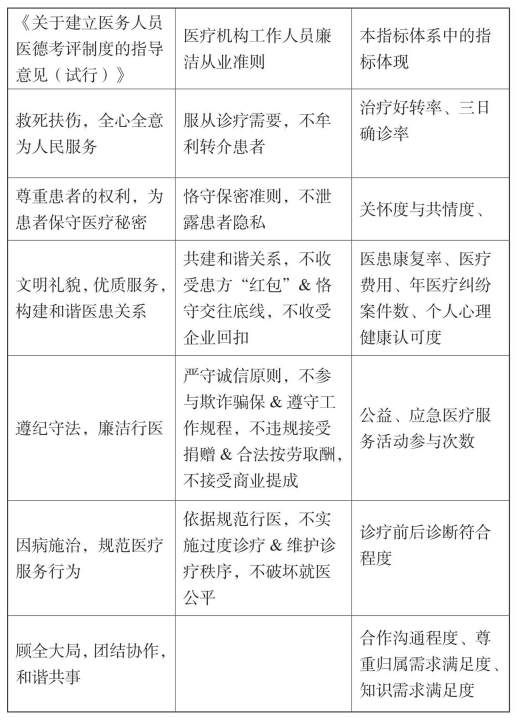 将所构建的公立医院医师绩效评价指标体系同国家对医师医德考评指导意见和医疗机构工作人员链接从业准则相比较(比较结果见表4-11),由此印证了所构建的医师绩效评价指标体系同国家对公立医院医师行业大发展形式的贴合。