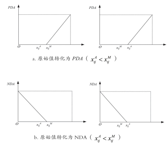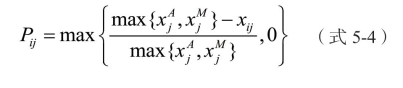 大小的比率。显然,当指标值劣于参照值的原始值,其奖励绩效值为0。同理, Pij意为原始 xij劣于分界点max