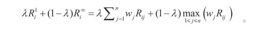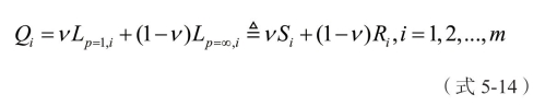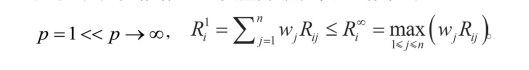 然而,怎样选择出一个合适的 p 值才该方法中最为困难的环节。针对p 值选择难题,学者Opricovic 提出了多指标妥协评价方法VIKOR[132,133],该方法的原理是依据参数 p 在 Lp-metric中的单调性将 p 值的选择难题转换为通过一个取值范围是[0,1]的权重系数v 来寻求 L p=1,i和Lp=∞,i间的线性补偿或者说平衡,权重v 也随着成为最大整体效用策略的权重,转换后其表达式如下: