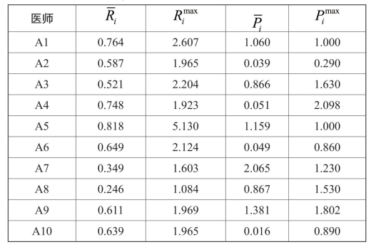 而后通过式(5-23)计算并衡量医师在相关群体需求满意度中的综合奖惩值。由于采用该方法需事先确定医师绩效指标间的平衡聚合规则,即指标间的补偿策略。评价专家们参协商后选取“少许补偿”反映他们的决策态度,对应 λ=0.091。此外,考虑到评价者在不同决策态势下有不同的风险态度,评价专家们经参协商后认为奖赏值和惩罚值应同等对待,故选取奖赏值和惩罚值的比例为0.5∶0.5,经计算具体结果如下: