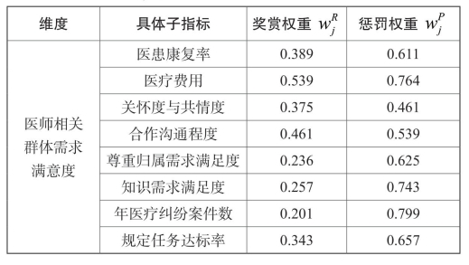 与上节相同,对于医师攸关方需求满意度维度的绩效指标优劣测度同样需要首先根据式(5-2)至式(5-5)计算医师绩效指标奖赏值 Rij和惩罚值 Pij。而后根据式(5-6)至(5-11)确定各指标奖赏权重、惩罚权重