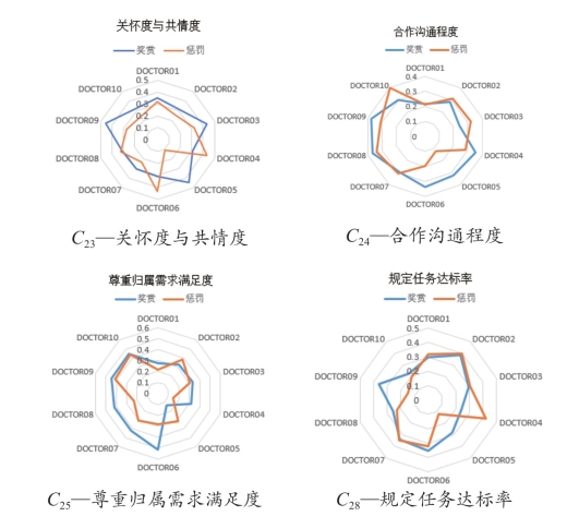 为了更为直观地观察待评医师在各指标下的具体表现差异,以指标“关怀度与共情度”“合作沟通程度”“尊重归属需求满足度”“规定任务达标率”为例,将加权后的医师绩效奖赏值和惩罚值