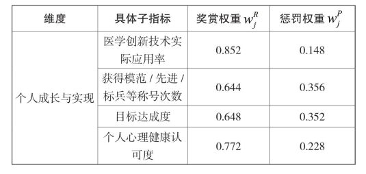与上节相同,对于医师相关群体需求满意度维度的绩效指标优劣测度同样需要首先根据式(5-2)至式(5-5)计算医师绩效指标奖赏值 Rij和惩罚值 Pij ,而后根据式(5-6)至式(5-11)确定各指标奖赏权重、惩罚权重