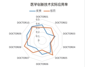根据图6-4 可知,这些医师在医学创新技术实际应用率指标下表现优劣不一,医师A2,A5,A7,A8表现为惩罚值大于奖赏值,即这几名医师处于中下水准,但这并不代表这几名医师创新技术缺失,而仅表示其提出的创新技术对于现实应用比例不高。这几位医师未来应更加侧重于关注医学现实需要,从而针对性提出更多适用于现实医疗需要的创新技术,为我国医疗的不断发展进步助添自身力量,不负党和国家的期望。
