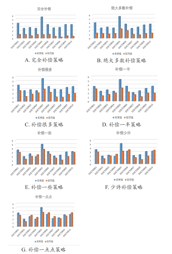 上述三种情景在评价情景认知中常被语言量化为“完全补偿”“补偿一半”和“完全不补偿”。然而评价专家在不同决策态势下的风险态度不同,评价者通过设立不同参数λ 以体现自身态度倾向,而参数值的不同会最终影响到指标之间的权重。因此,本文在其余评价情景中分别假设专家对医师评价绩效系统的补偿策略为“少许补偿”,“补偿一些”,“补偿很多”,以及“绝大多数补偿”,这些情景下的医师综合绩效评价结果如图6-5(A ~ G)。