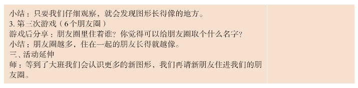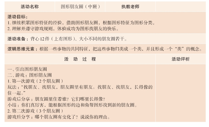 这个集体学习活动目标中的逻辑思维元素是提升幼儿分类的逻辑思维水平。整个活动中有三次分类,始终围绕着目标中的核心经验——分类的能力;而活动过程都是以幼儿自己扮演一个图形的角色,开展找朋友圈的游戏活动,体现了活动的游戏特质。活动设计中,教师紧紧围绕活动重点、难点,关注活动的有效性。