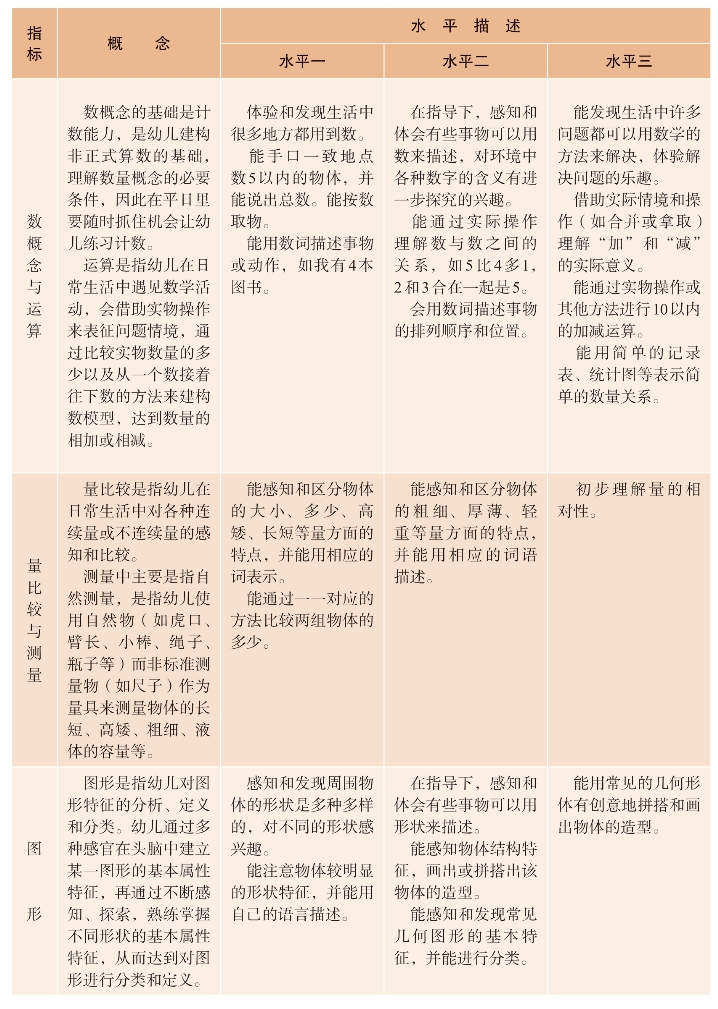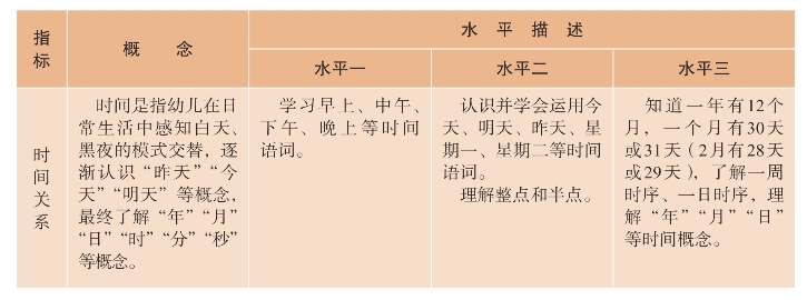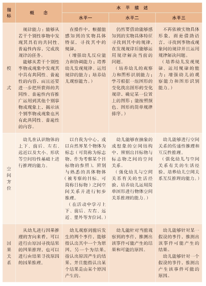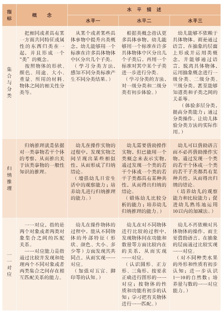 发展指标要素共有集合与分类、一一对应、时间关系、因果关系、归纳推理、模式、数概念与运算、量比较与测量、图形、空间方位10个发展项目,每个指标分为三个水平。水平描述中的水平一、水平二、水平三并非特指年龄阶段,幼儿的逻辑思维发展中差异性大,可能某种能力发展较快。所以不同指标只能显示幼儿的逻辑思维水平发展现状,是教师或家长培养幼儿的依据。