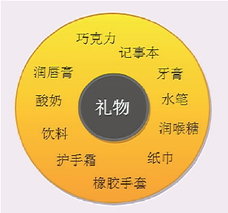 根据一些事物的共同特征而把这些事物归成一个“类”——礼物,并且形成一个“类”的概念,是建立在比较、分析、抽象和概括的基础上的。每一个类概念,都需要用一定的词语来表达。所以在培养幼儿类概念形成能力的过程中,幼儿思考并表达出想给妈妈采购的礼物是极其重要的。圆圈图可用来定义一件事或一个物体,使幼儿对核心主题的认识更加明确。借助思维导图更是让幼儿的思维“看得见”,符合中班幼儿以具体形象思维为主的思维特点。