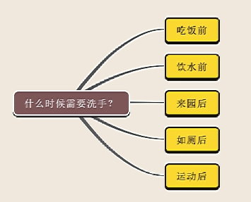 在创设盥洗室文化时,教师和幼儿共同讨论“什么时候需要洗手”,通过交流分享,幼儿知道饭前要洗手、饮水前要洗手、运动后要洗手、如厕后要洗手、来园后要洗手等,教师利用括号图(见图6)将幼儿讨论的结果绘制下来(也可让幼儿进行绘制),并贴于盥洗室内。