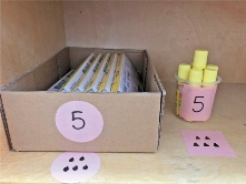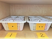 而点数对应的标识同样对幼儿提出了挑战,要求幼儿在区分颜色的基础上,通过点数找到相应的数字,锻炼幼儿的分类和点数能力。生活中,常常有幼儿会放错物品,而因为对应的唯一性让后来的幼儿在无处可放时发现前者的错误,同伴间的互助、探索让学习更自主。