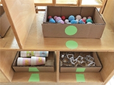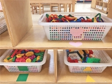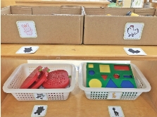 同时,他们渐渐发现了教室中更多隐藏着的标识。例如,在角色游戏的各个区域里,每一件物品的摆放处都贴有相应的照片,幼儿在整理时会自觉、自发地观察照片上的物品,并做到一一对应摆放。而在图书架、建构材料、美工材料等处,则是使用了形状和颜色对应的标识,来引导幼儿按照特征进行分类并一一对应。